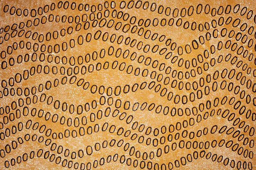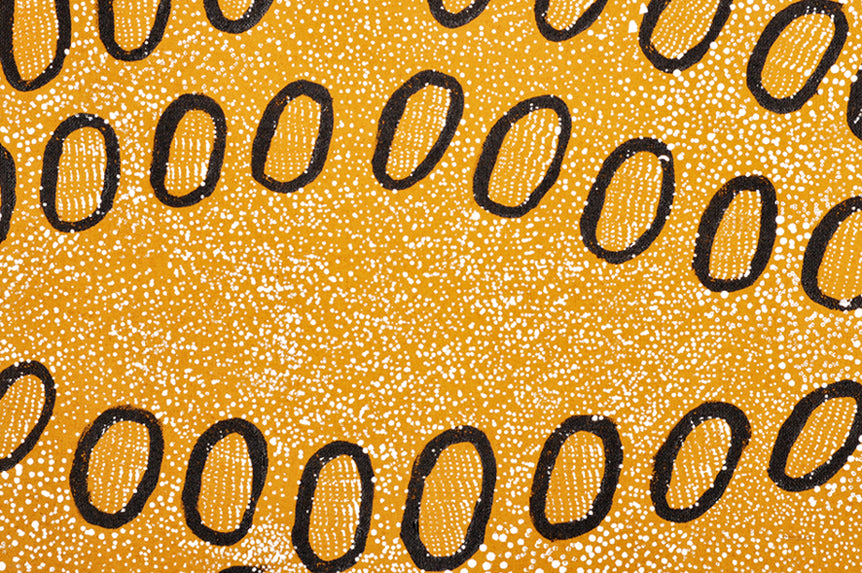 Ngoia paints her father’s country, which is a sacred Warlpiri territory. The oval shapes in her paintings are an iconographic representation of the swamps and lakes near Nyrripi (Talarada) north west of Mount Liebig, approx 200kms west of Alice Springs. The fine detailed dots represent the water drying up and the cracks in the ground forming.